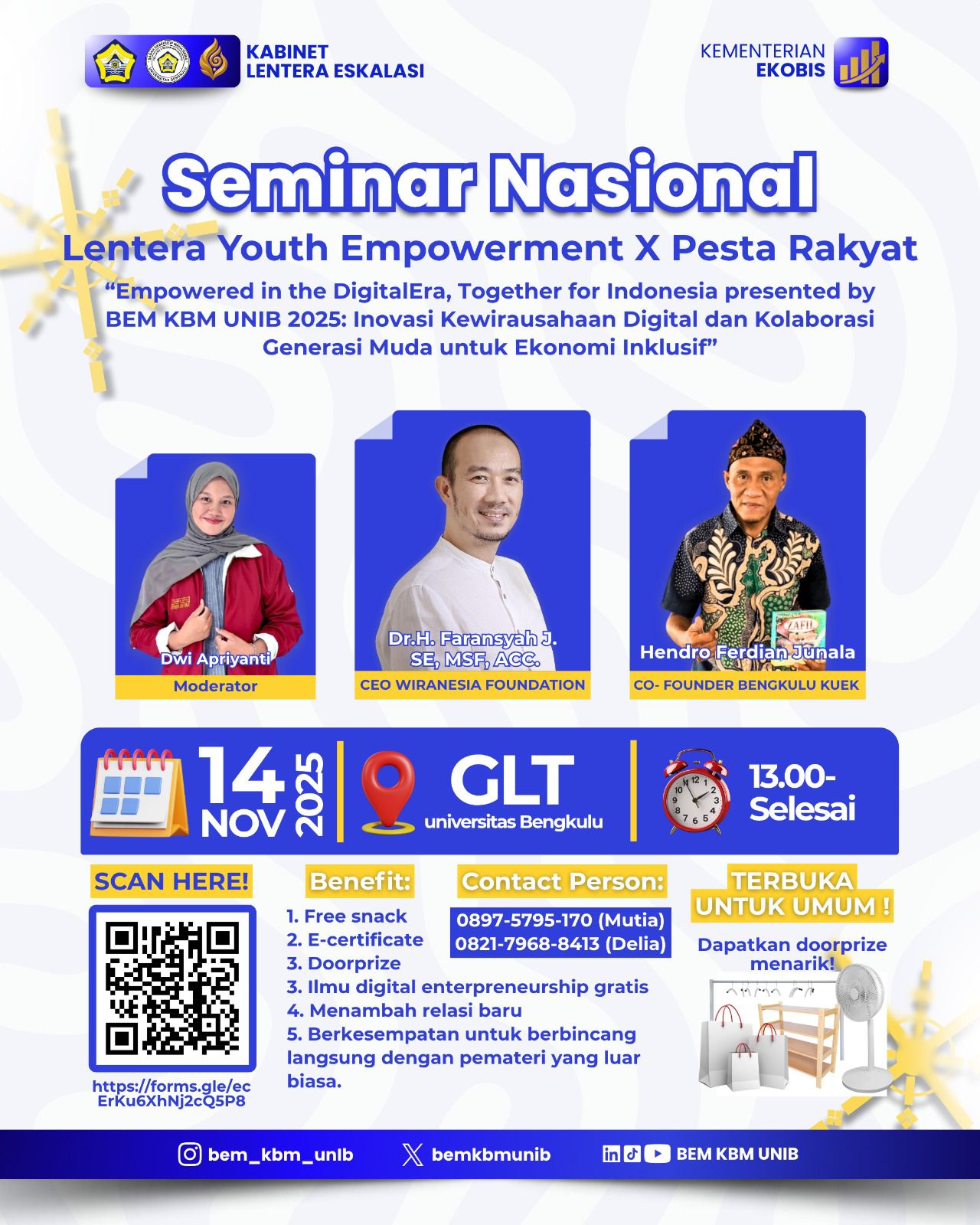 Kegiatan yang berlangsung di Gedung Layanan Terpadu (GLT) Universitas Bengkulu ini menghadirkan dua narasumber inspiratif, yakni Dr. H. Faransyah Jaya, SE., MSF., ACC., selaku CEO Wiranesia Foundation, dan Hendro Ferdian Junala, Co-Founder Bengkulu Kuek. Acara dipandu oleh Dwi Apriyanti sebagai moderator.