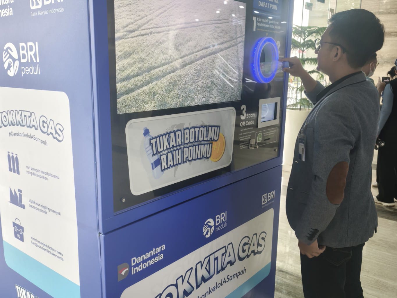 Mesin daur ulang BRI, yang dikenal sebagai Reverse Vending Machine (RVM) melalui program BRI Peduli – Yok Kita Gas merupakan mesin pintar untuk menukarkan botol plastik bekas menjadi saldo e-wallet (Plastikpay).